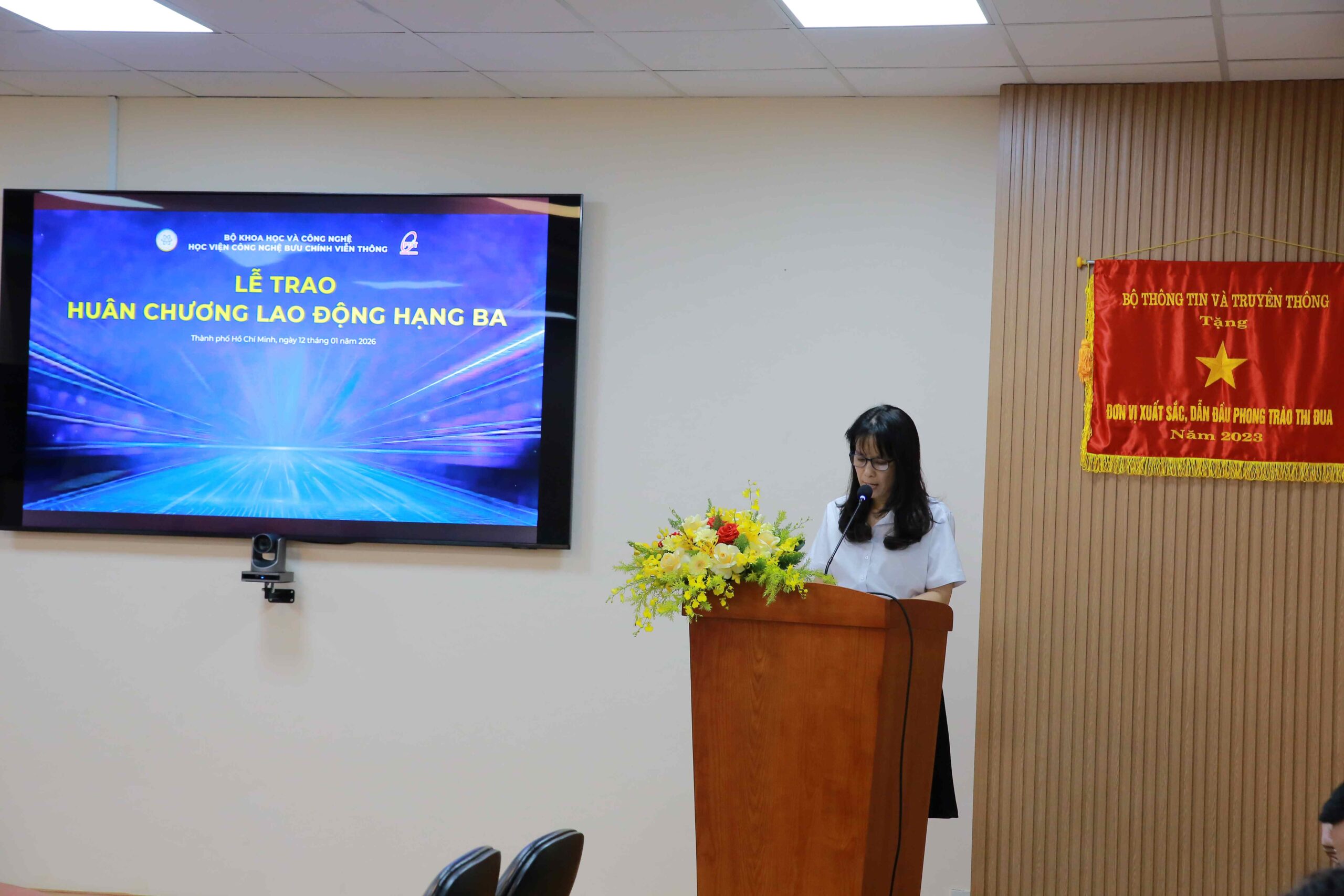 Bà Đặng Thu Hà – Thường trực Hội đồng Thi đua, Khen thưởng Học viện đã công bố Quyết định của Chủ tịch nước Cộng hòa xã hội chủ nghĩa Việt Nam về việc trao tặng Huân chương Lao động Hạng Ba cho TS Tân Hạnh