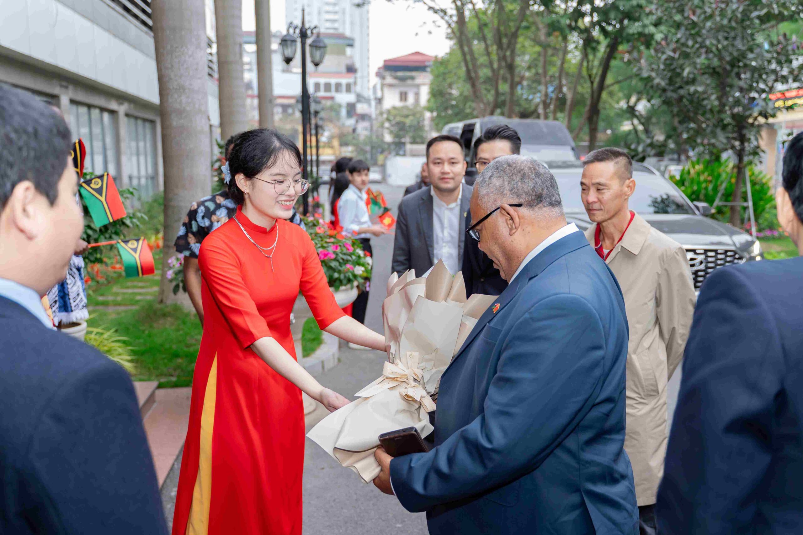 Thủ tướng Cộng hòa Vanuatu Jotham Napat và đoàn đại biểu, sinh viên Học viện chào mừng
