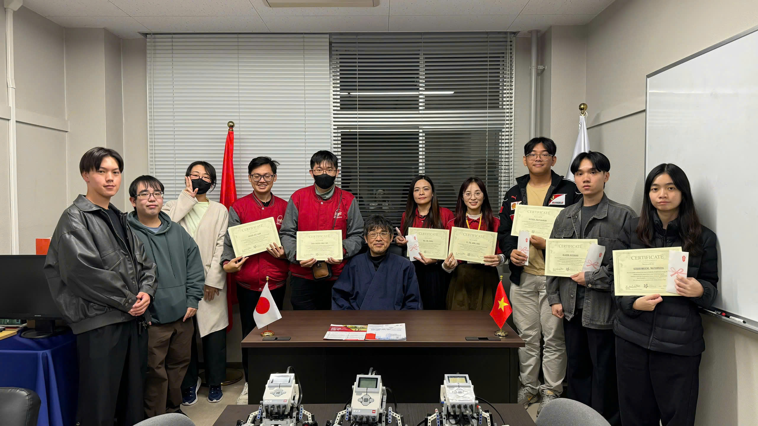 Trong thời gian học tập và trao đổi tại Nhật Bản, ba sinh viên đã được hướng dẫn và làm việc cùng nhóm nghiên cứu của Đại học Gunma tại Văn phòng Hợp tác Đào tạo & Nghiên cứu PTIT tại Nhật Bản, dưới sự hướng dẫn của TS. Mai Thị Nghĩa – Trưởng bộ môn Điều khiển & Tự động hóa, Khoa Kỹ thuật Điện tử 1, đồng thời là cán bộ thường trú của PTIT tại Nhật Bản. Tại đây, sinh viên PTIT cùng sinh viên Nhật Bản và Thái Lan đã phối hợp thành lập các nhóm nghiên cứu về chế tạo, lập trình và tích hợp trí tuệ nhân tạo (AI) cho robot tự cân bằng.