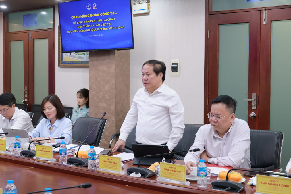 Ngày 27/3/2026, UBND tỉnh Lai Châu đã có buổi thăm và làm việc với Học viện Công nghệ Bưu chính Viễn thông. Các đồng chí: Tống Thanh Hải – Uỷ viên Ban Thường vụ Tỉnh uỷ, Phó Chủ tịch Thường trực UBND tỉnh Lai Châu; Đặng Hoài Bắc – Giám đốc Học viện Công nghệ Bưu chính Viễn thông chủ trì buổi làm việc. Dự buổi làm việc có đại diện lãnh đạo các sở, ban, ngành tỉnh Lai Châu; lãnh đạo các khoa, phòng, ban thuộc Học viện Công nghệ Bưu chính Viễn thông.